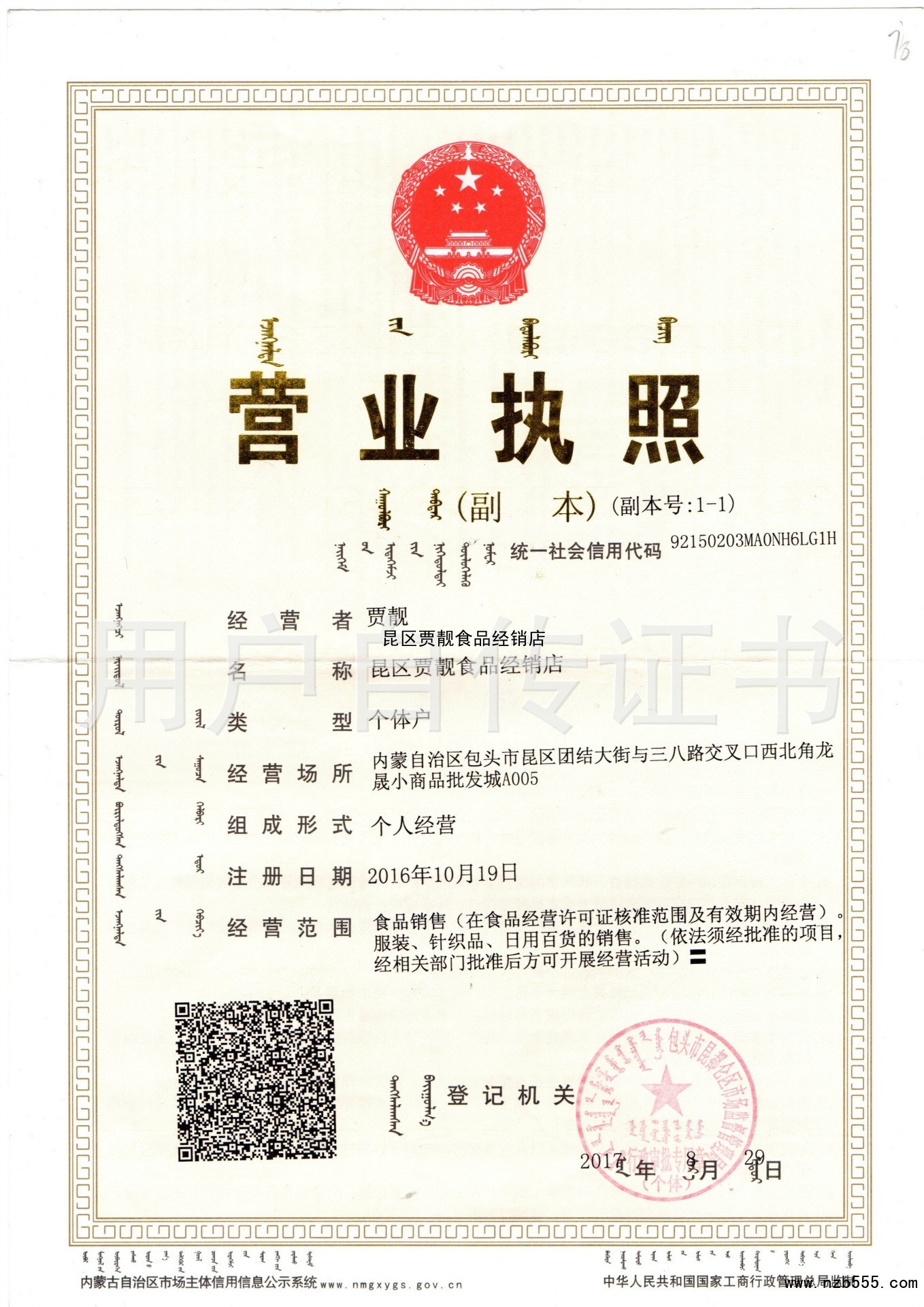 | 發(fā)證機(jī)構(gòu): | 包頭市昆都侖區(qū)市場(chǎng)監(jiān)督管理局 | 發(fā)證時(shí)間 : | 2017-08-29 |