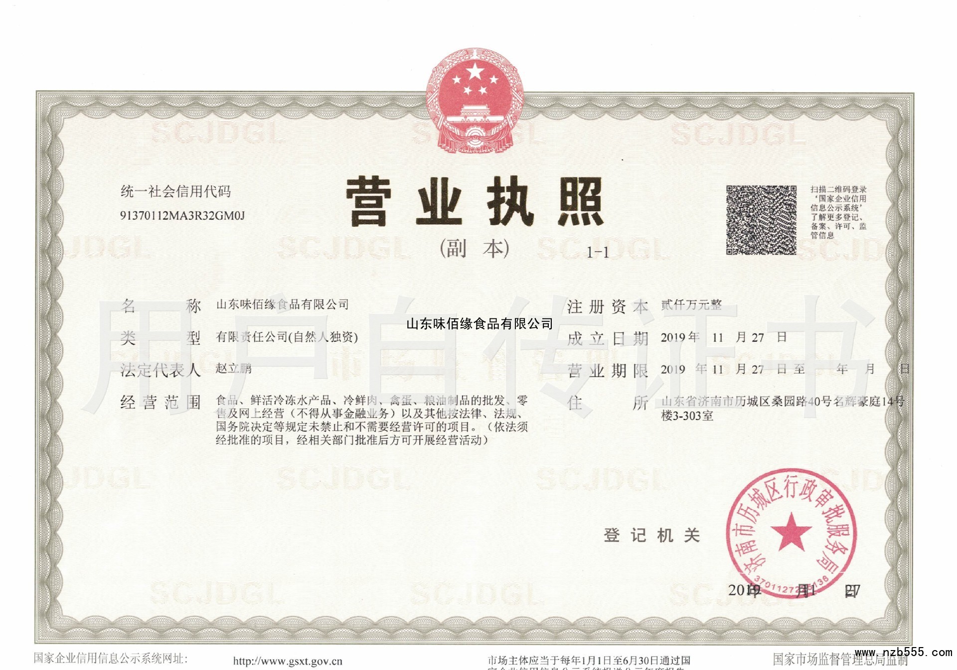 | 發(fā)證機(jī)構(gòu): | 濟(jì)南市歷城區(qū)行政審批服務(wù)局 | 發(fā)證時(shí)間 : | 2019-11-27 |