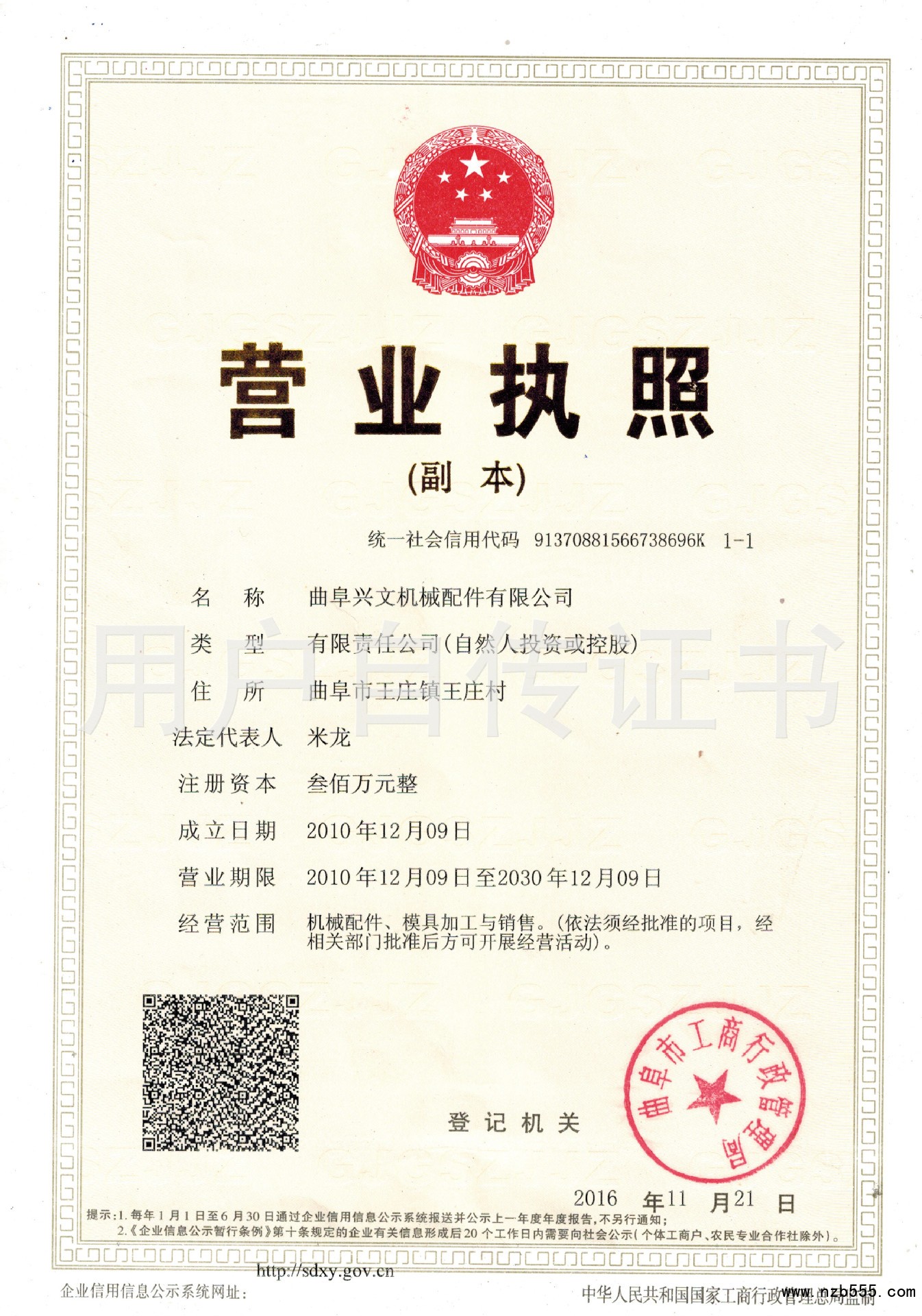| 發(fā)證機(jī)構(gòu): | 曲阜市工商行政管理局 | 發(fā)證時(shí)間 : | 2016-11-21 |