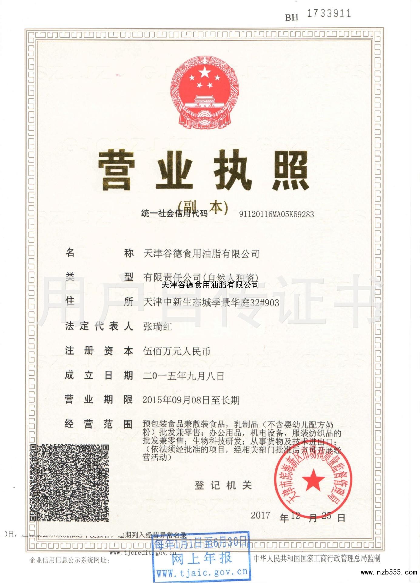| 發(fā)證機(jī)構(gòu): | 天津市濱海新區(qū)市場(chǎng)和質(zhì)量監(jiān)督管理局 | 發(fā)證時(shí)間 : | 2017-12-25 |