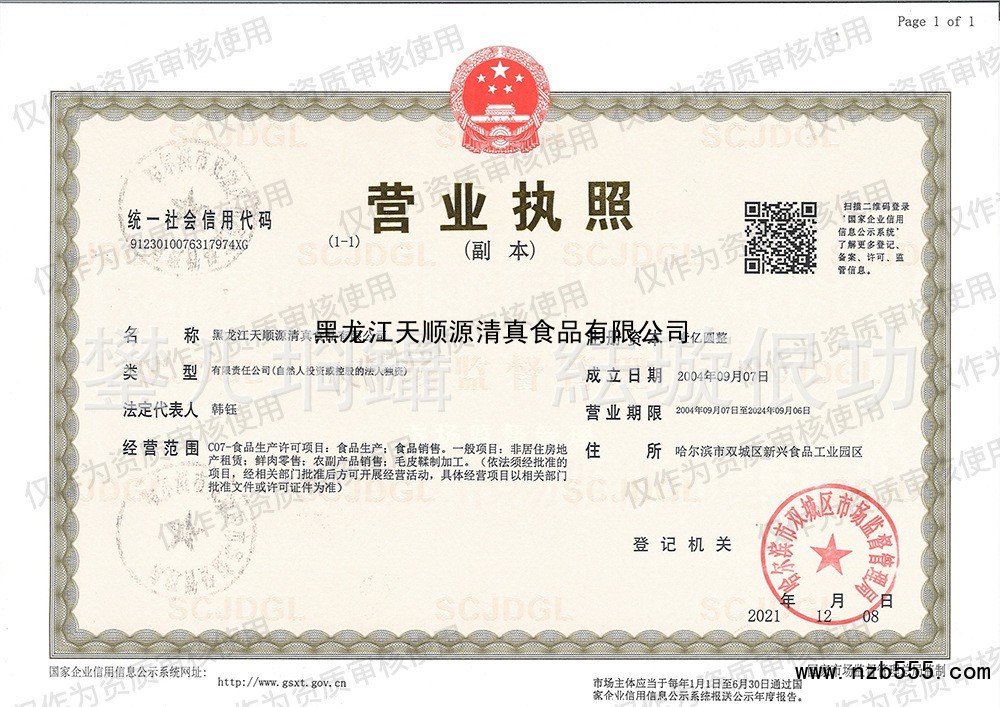 榮譽(yù)資質(zhì) 黑龍江天順源清真食品有限公司