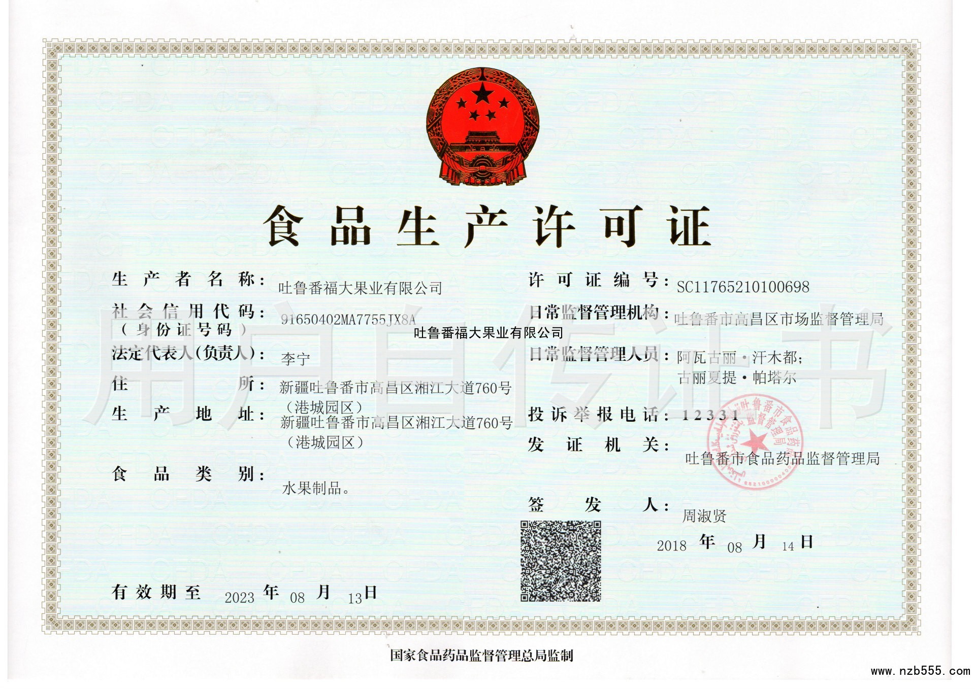 | 發(fā)證機(jī)構(gòu): | 吐魯番市食品藥品監(jiān)督管理局 | 發(fā)證時間 : | 2018-08-14 |
