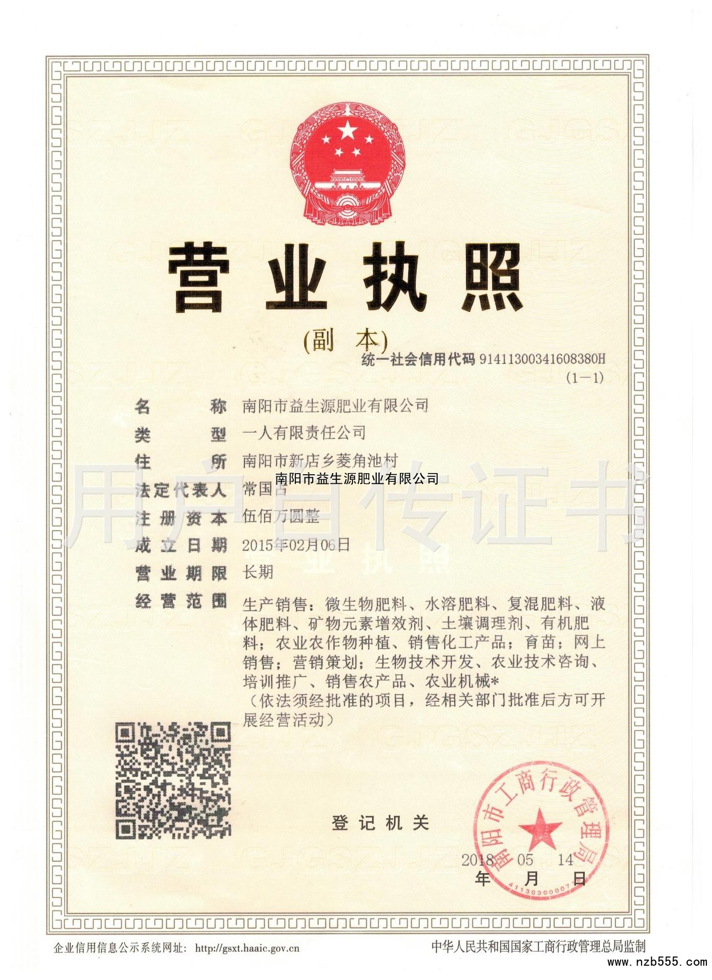 | 發(fā)證機(jī)構(gòu): | 南陽(yáng)市工商行政管理局 | 發(fā)證時(shí)間 : | 2018-05-14 |
