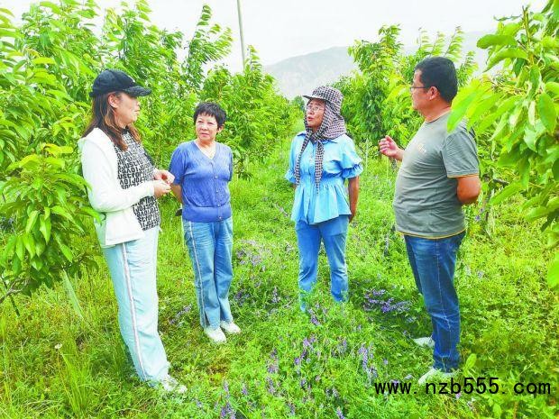 討論櫻桃地里毛葉苕子長勢。攝影:薛萬財(cái)