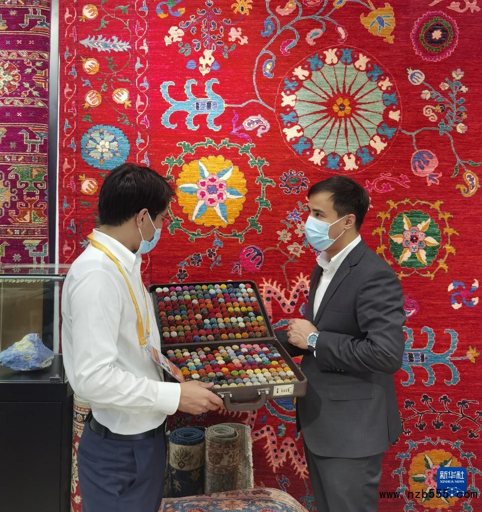 阿富汗參展商阿里·法伊茲(右)在第四屆中國國際進口博覽會阿富汗手工羊毛地毯展臺忙碌(2021年11月5日攝)。新華社記者 吳宇 攝