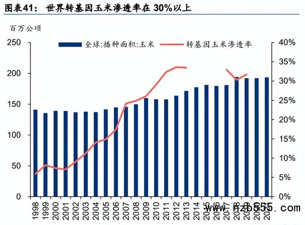 世界轉基因玉米和大豆普及率較高:從轉基因農作物在世界上的普及程度上來看,轉基因 玉米和大豆是世界上種植面積最大的兩種轉基因農作物,據 Wind,其種植面積分別占世界 轉基因作物的 50%左右和 30%左右,其次為轉基因棉花和轉基因油菜。世界轉基因玉米滲 透率在 30%以上,轉基因大豆滲透率在 80%左右。轉基因玉米和大豆在國外尤其是美國擁 有接近 30 年的種植歷史,轉基因農作物在提升植物抗蟲性、抗藥性、抗逆性等方面有著獨 特的優勢,并且由于可以減少病蟲災害的影響,對應產量有所提升。