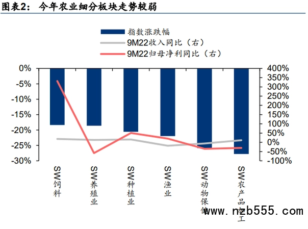 2022 年 1-10 月農林牧漁板塊走勢較差,錄得 20%以上的跌幅,下跌的原因主要為行業預 期的轉弱,各個細分板塊均錄得 18%以上跌幅。 1)養殖業:今年 1-10 月畜禽養殖錄得 19%的跌幅,主要原因是雖然虧損幅度減少,但前 三季度仍然虧損 72 億元,再加上市場對后續畜禽價格有所擔心,因此板塊出現較大幅度下 跌,前三季度收入同比上升 13%,凈利潤減虧; 2)飼料行業:飼料板塊錄得 18%的跌幅,我們認為主要因為板塊中企業大多從事養殖行業, 雖然業績表現有所改善,但仍未扭轉市場預期,板塊前三季度收入同比上升 18%,歸母凈 利同比上升 332%; 3)動物保健:板塊前三季度同比去年收入&凈利均有所下降,下跌原因為盈利水平與估值 水平的雙降,前三季度收入同比下降 6%,歸母凈利同比下降 35%。