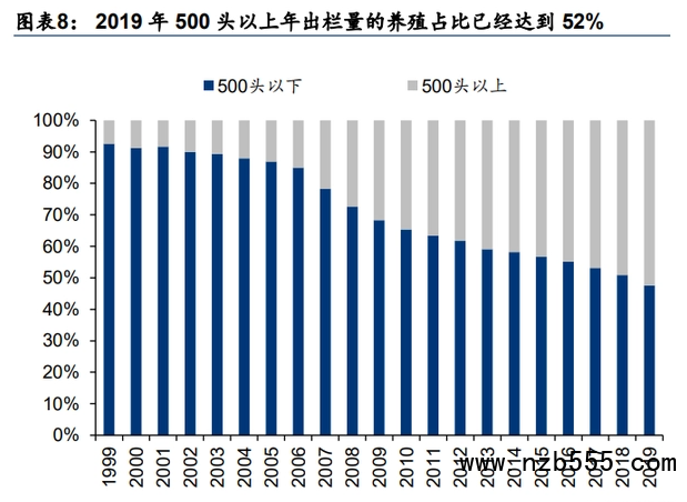 規模戶出欄量占比持續提升。大型規模養殖戶(企業)數量一直處于快速增加的態勢,2020 年最高達到了 554 戶。2019 年下降是由于非瘟疫情,生豬行業繼續整合的趨勢不變。根據 中國畜牧獸醫年鑒,2019 年 500 頭以上年出欄量的養殖占比已經達到 52%,2020-2021 年為規模戶快速上量的階段,集團企業擁有資金優勢與種豬優勢,2021 年市占率有望繼續 提升。據農業部新聞,2021 年全國 500 頭以上年出欄量的養殖占比達到 60%左右。