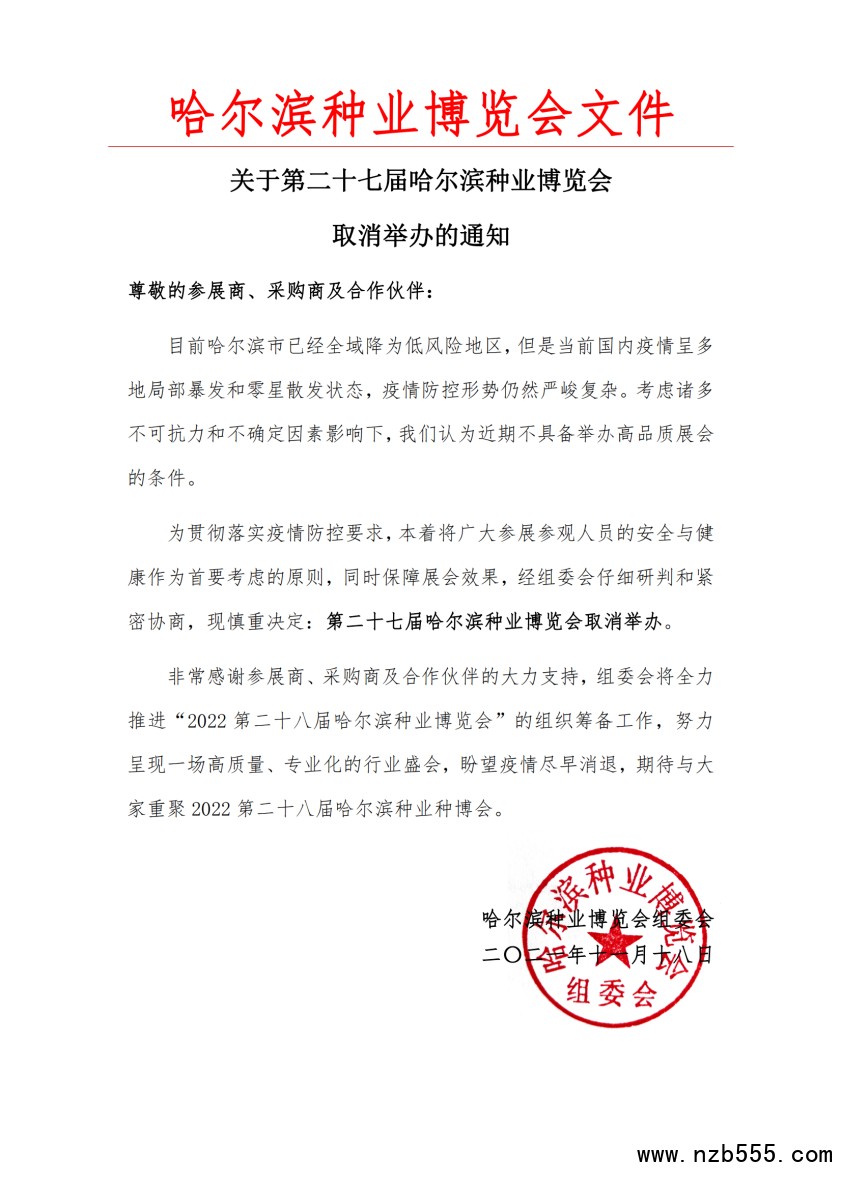 11月18日,從哈爾濱種業(yè)博覽會組委會獲悉,為保障展會效果,同時將廣大參展參觀人員的安全與健康作為首要考慮的原則,經(jīng)組委會仔細研判和緊密協(xié)商,現(xiàn)慎重決定:第二十七屆哈爾濱種業(yè)博覽會取消舉辦。